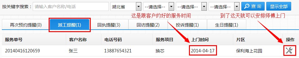 在派工提醒页面可以留意,是否已到约定的上门时间,这里如果有多条派工记录,当然会显示最近需要安排的派工任务,点击操作栏的“派工”按钮会自动跳转到此客户的派工页面:
