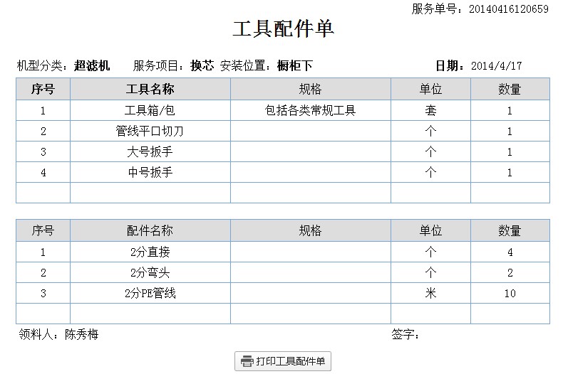 怕师傅上门忘带工具配件,或者带出去的东西不知道有没有归还,您还可以打印《工具配件单》作为领用记录,方便追溯去向,如下图,有关工具配件管理详情,请点此“工具配件管理”查看;