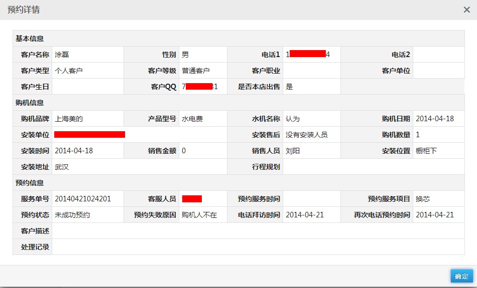 选择一笔客户,点击操作栏位下的“查看详情”,弹出该客户的预约详细信息,点击“确定”关闭预约详细信息弹出框。如下图