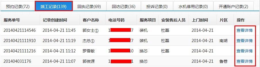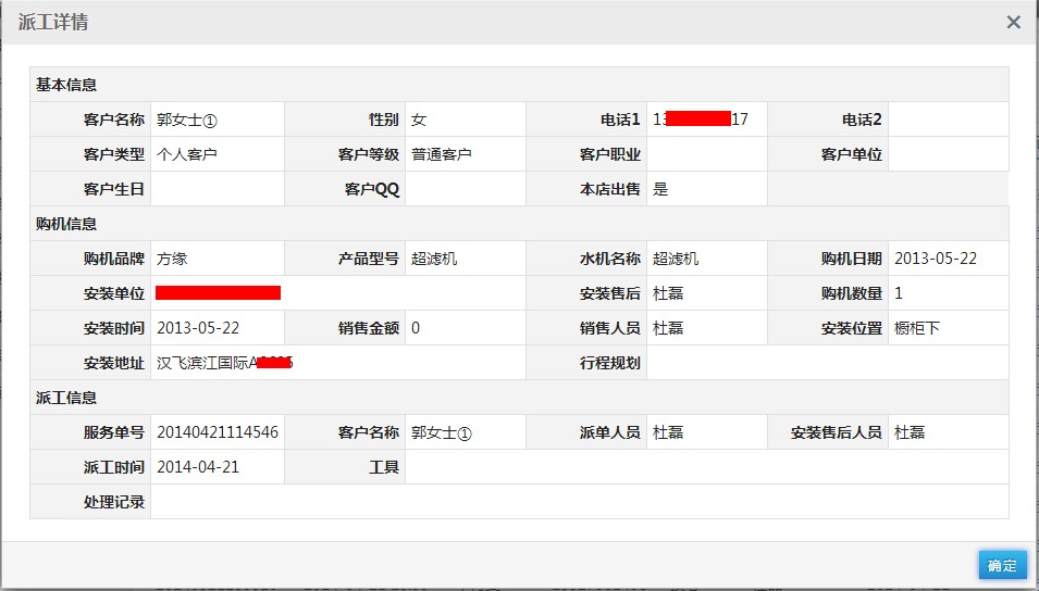 选择一个客户,点击操作栏位下的“查看详情”,弹出该客户的派工详细信息,点击“确定”关闭派工详细信息弹出框。如下图