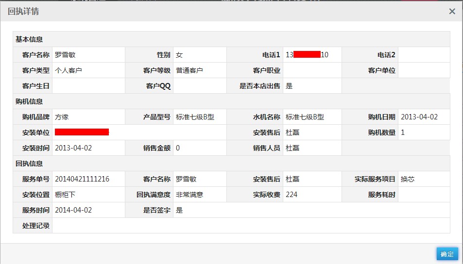 选择一个客户,点击操作栏位下的“查看详情”,弹出该客户的回执详细信息,点击“确定”关闭回执详细信息弹出框。如图7