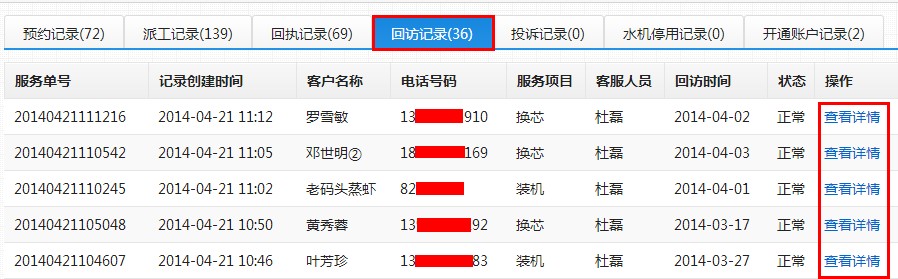 第六步:点击标签页中的“回访记录”,可以查看已做过回访的客户回访信息,如下图;