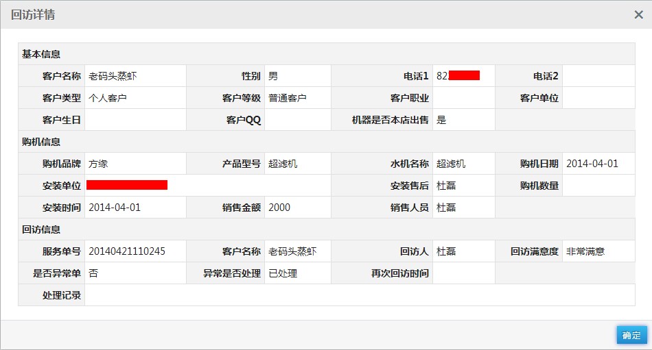 选择一个客户,点击操作栏位下的“查看详情”,弹出该客户的回访详细信息,点击“确定”关闭回访详细信息弹出框。如下图: