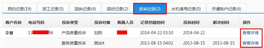 第七步:点击标签页中的“投诉记录”,可以查看已做过投诉的客户投诉信息,如下图: