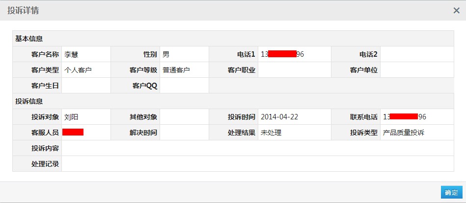 选择一笔客户,点击操作栏位下的“查看详情”,弹出该客户的投诉详细信息,点击“确定”关闭投诉详细信息弹出框。如下图: