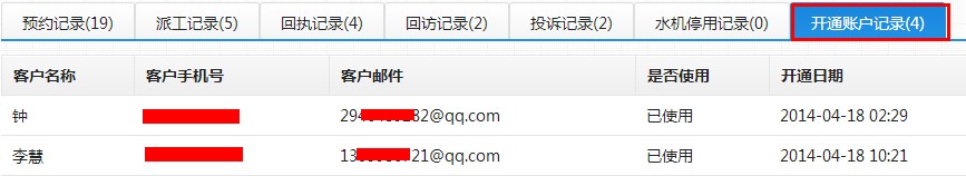 第九步:点击标签页中的“开通账户记录”,可查看已有哪些客户开通。这里的“开通账户”是指给您的客户以水机用户身份在水事易系统开通一个账户,便于以后线上报修。具体功能详见“线上服务流程管理”;
