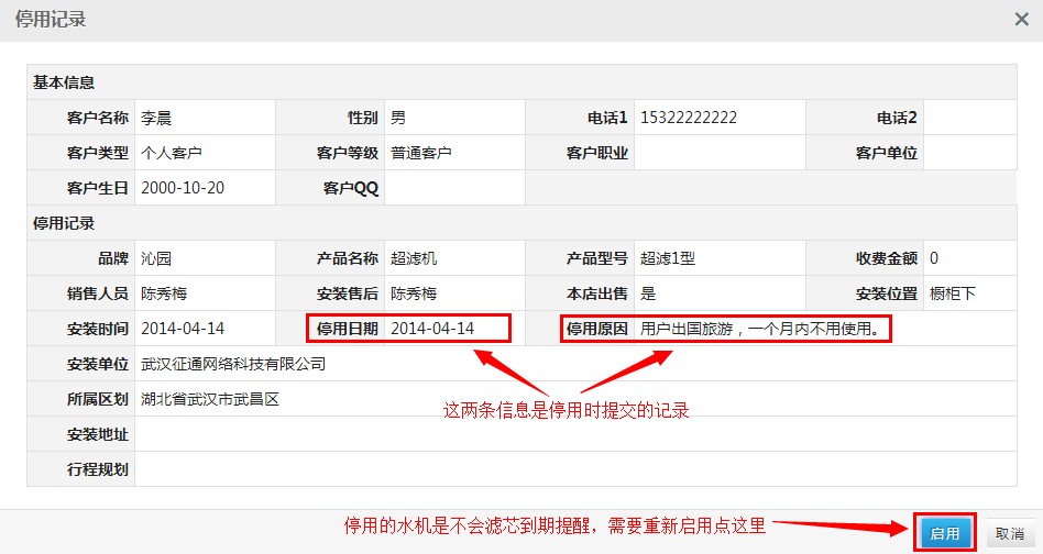 选择一个客户,点击操作栏位下的“查看详情”,弹出该客户的停用的详细,点击“确定”关闭水机停用详细信息弹出框。如下图: