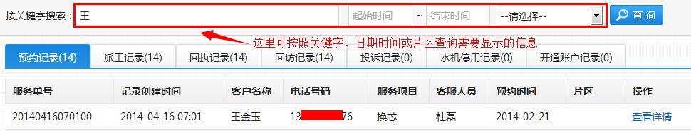第二步:输入客户的姓名、服务单号、电话号码、时间、地点信息,点击“查询”按钮,可以进行模糊查询客户服务记录。如下图: