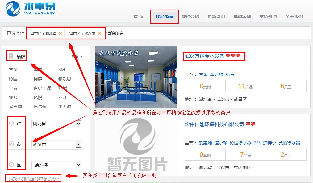 如下图,在商户列表页面,终端用户可以根据自己使用产品的品牌和所在地筛选附近合适的商户为您排忧解难。
