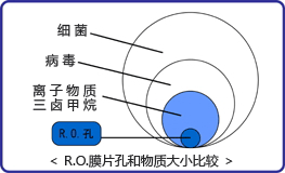 逆渗透膜(RO膜片)是由无数孔径约0.0001微米 (细孔可以将三卤甲烷、细菌、重金属、有机氯化物、农药等确实去除)的小孔构成,只有水分子能够通过的半透膜。