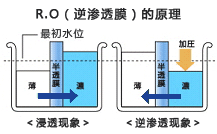利用这种只能通过水的半透膜的特性,在浓度高的溶液(含有杂质的自来水等)一侧加压,只让清水移动到膜的另一侧,这就是逆渗透(R.O.)的结构原理。